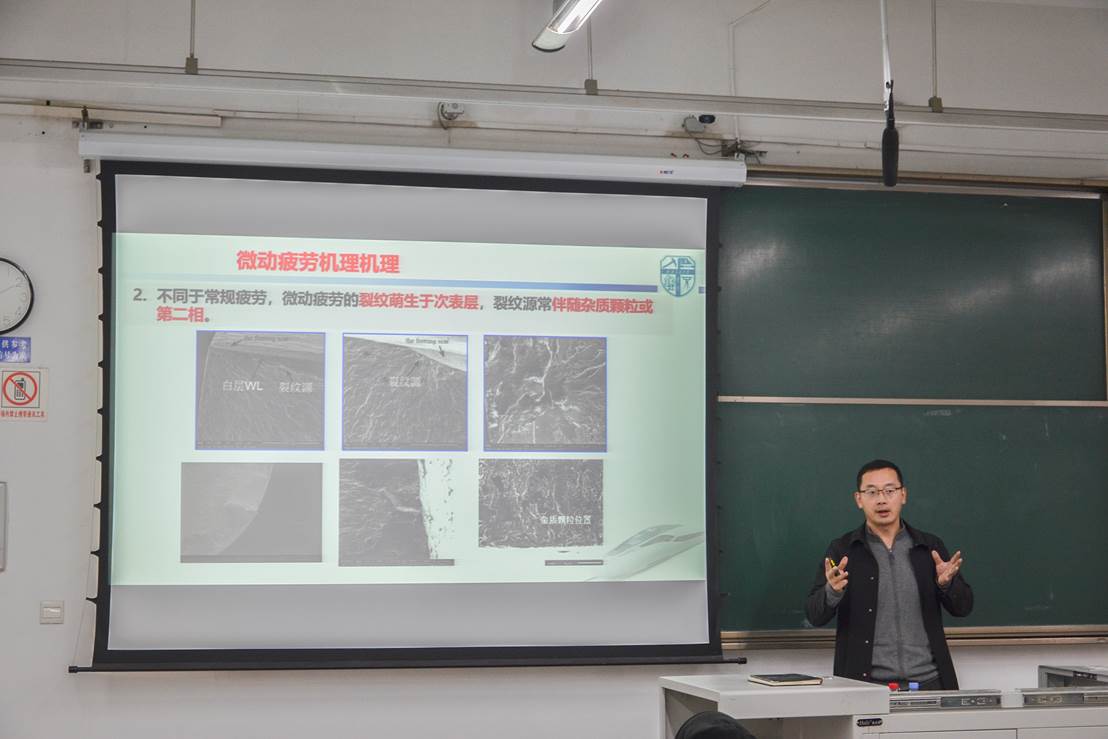 提及微动损伤部件、轨道交通的微动损伤现象时,樊小强多次向同学们强调了微动损伤的危害性,并指出微动就是工业界的“癌症”,不仅难以发现,还会带来较大的危害,这需要研究人员从根本上理解微动疲劳机理,才能攻克这一难题。樊小强借此向同学们详细介绍了减缓微动损伤的原理及措施。