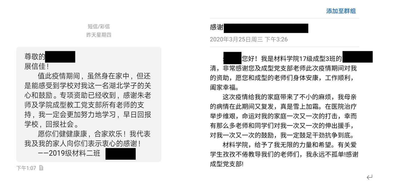 病毒无情人有情,为关心帮助特困生顺利度过疫情难关,表达老师们的爱心,为他们送去温暖,材料加工教工党支部在材料加工系范围内组织了教职工爱心捐款活动,定向资助材料成型及控制工程专业的特困生。自爱心捐款活动发起以来,截至2020年3月14日,共收到广大教师捐款共计13800元。经材料加工教工党支部全体成员研究决定,爱心捐款定向资助6名材料成型及控制工程专业的困难本科生。目前,爱心捐款已全部送达6位同学的手里。收到爱心资助后,6位同学纷纷表达了对学校、学院和老师们的感谢。