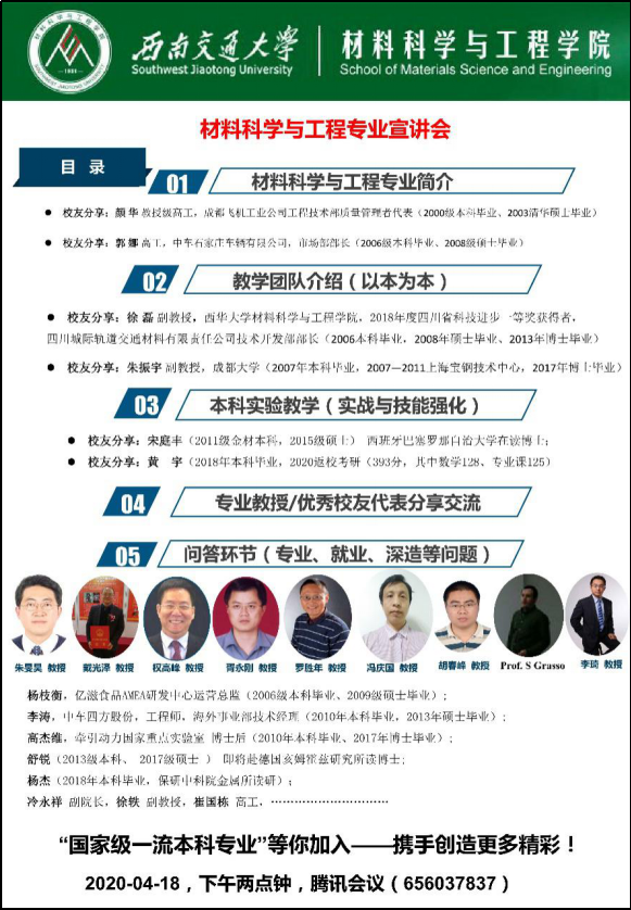 为在疫情期间切实做好2019级材料类本科生的专业分流工作,帮助2019级本科生了解材料科学与工程专业优势特色,选择更适合个人发展的专业方向,根据公司统一部署,2020年4月18日下午2点,金属材料系通过腾讯会议平台组织开展了材料科学与工程专业(金属与无机非金属方向)的专场宣讲。