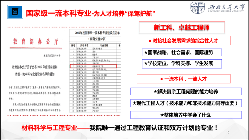 其中,胥永刚教授结合科研工作开展了详细而又专业的讲解,让同学们深深地感到了金属材料的魅力。楚珑晟副教授简明扼要的介绍加深了同学们对无机非金属材料理解和认知,并寄语大家“海阔凭鱼跃,天高任鸟飞”。王良辉工程师对实验平台以及学科竞赛的介绍更是激发了同学们参加实践课程和各类竞赛的浓厚兴趣。老师们还从现状分析、产业导向、跨界交融三个方向深入的阐释了“双万计划”对人才培养方式的改变与对未来的影响,让同学们感受到材料科学与工程专业的巨大发展潜力。