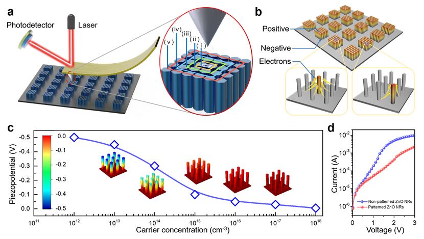 图3. 电势屏蔽效应物理机制研究 (a)压电力显微镜的测试示意图,放大图表示探针扫描范围逐次扩大;(b)电势屏蔽效应在单个ZnO纳米棒阵列单元中不同位置的原理图;(c)应力作用下模拟的不同载流子浓度的ZnO纳米棒压电势;(d) 图案化和非图案化结构器件的I-V特性曲线。