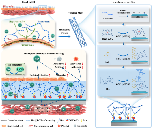 最近,k1体育十年品牌黄楠/杨志禄教授联合江苏大学潘国庆教授,从内皮细胞仿生设计出发,通过层层接枝的方法,构建了一个具有双功能仿生的涂层,用于心血管类支架材料的表面改性,以期解决心长期困扰着心血管支架在长期植入过程中会出现再狭窄和晚期血栓的一个重要临床医学问题(图1)。在这项研究中,NO生成的Cu2+螯合DOTA和典型的糖萼组分透明质酸(HA)通过水连续逐层的固定在等离子聚烯丙胺(PPAm)涂层支架上。逐层接枝策略可以独立控制每个接枝层上的生物分子密度和含量,从而便于在多组分修饰中调整和优化表面功能。具体地说,DOTA单侧的羧基首先被用于与支架上PPAm的氨基偶联,剩下的羧基用于二次接枝。为了获得高的HA接枝密度,进一步利用PAa将羧基转移到多个氨基来放大反应位点。从而得到一个成分可控的且拥有高度内皮仿生的心血管支架涂层。