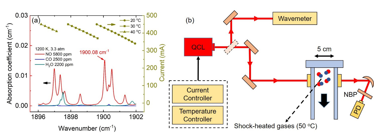 团队与香港中文大学任伟教授合作,建立了用于激波管含氮燃料研究的中红外激光吸收光谱在线测量系统(图2)。从而实现了从理论计算、机理构建与激波管实验验证的相互支持的自主研究模式。相关成果以“Shock tube measurement of NO time-histories in nitromethane pyrolysis using a quantum cascade laser at 5.26 μm”为题同期发表在Proceedings of the Combustion Institute上。博士研究生尚艳磊和王震博士为论文的共同第一作者,甯红波助理研究员、任伟教授为共同通讯作者。