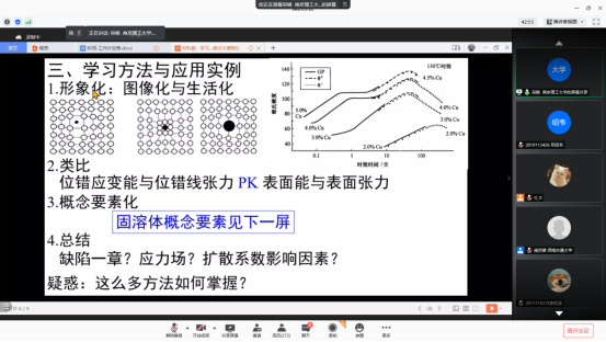 在对象重于方法的讲述中,吴锵教授以数学公式背后的概念引出高熵合金,提出同学们在学习《材料科学基础》的过程中应该注重于对象的学习。之后吴锵教授讲到同学们在认识重难点的时候应该养成从背景认识宏观思路与微观方法,然后才得出结论的科学方法,并以反应扩散为例详细介绍了这一方法。随后吴教授讲述了形象化、类比、概念要素化等学习方法,并以固溶体为例详细讲述了概念要素化,为材料学子们学习《材料科学基础》提供了重要的学习方法。最后,吴教授介绍了学习与科研的关系,并总结了本次讲座的结论——学习以明确对象/掌握方法为核心。最后在材料学子们的感谢声中,本次讲座圆满结束。