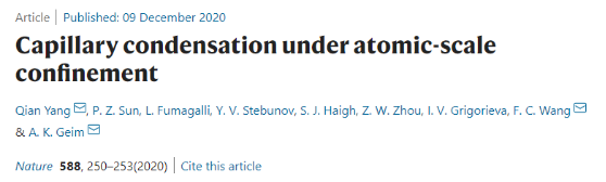12月10日出版的国际顶级学术期刊《Nature》发表了我院博士毕业生杨倩(现为英国曼彻斯特大学博士后)为第一作者的文章Capillary condensation under atomic-scale confinement (Nature, 2020, 588, 250–253 , https://doi.org/10.1038/s41586-020-2978-1),报道了纳米限域毛细凝聚新理论,并对传统开尔文公式进行了修正,使其能够更好地描述亚纳米尺度的毛细凝聚现象,为解开毛细凝聚这一百年谜题提供了方案。材料科学与工程公司(材料先进技术教育部重点实验室)教授、前沿科学技术研究院经理周祚万博士为该文章的共同作者。