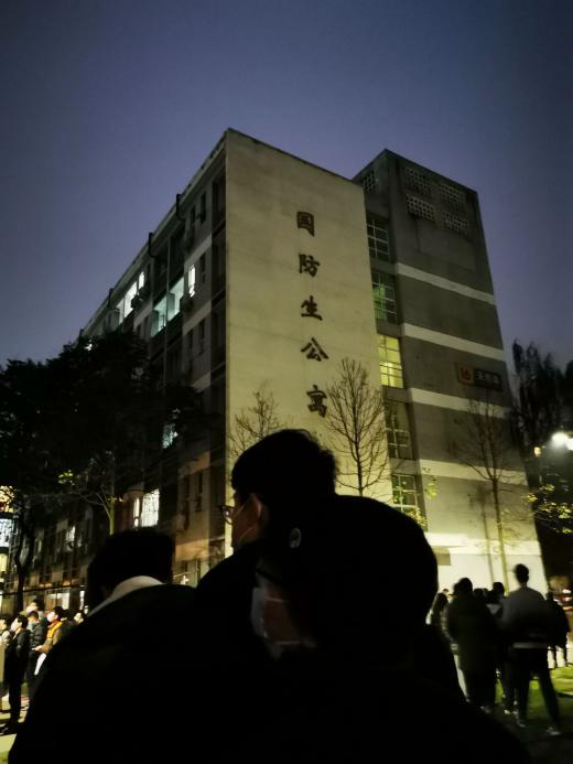 临近公司检测时段,在辅导员们与各班委协同组织下,同学们以年级和班级为单位有序列队,快速就绪,等待检测。