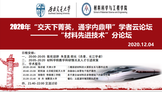 为了促进学术交流,吸引海内外优秀青年学者深入了解k1体育十年品牌k1体育、加盟交大k1体育,共谋发展,k1体育于2020年12月04日晚八点利用腾讯会议平台举办了第四届“交天下菁英,通宇内鼎甲”学者论坛——“材料先进技术”分论坛。