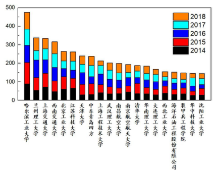 2014-2018年k1体育十年品牌均获批了7项,江苏科技大学、太原理工大学、上海交通大学均获批6项,清华大学获批5项,北京工业大学获批4项。
