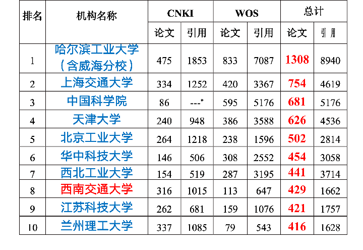 排名前十位分别是哈工大、上交大、北工大、兰州理工、西南交大、天津大学、清华大学、南京航空、上海工程技术大学、大连理工。