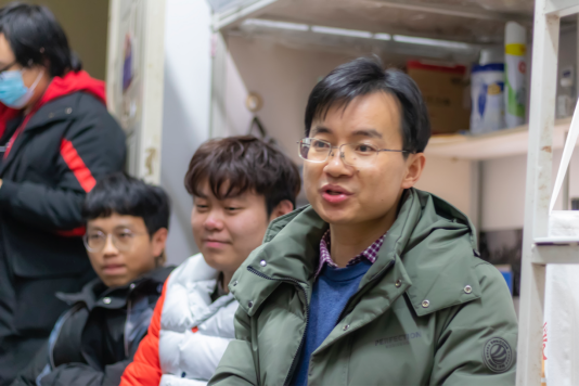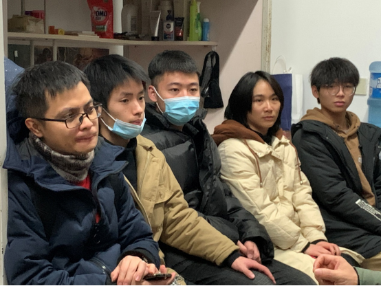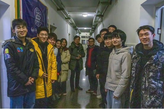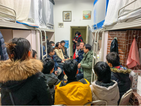 为了方便交流,走访的老师们和同学们齐聚一间寝室,为这次跨年增添了许多热闹与欢快。