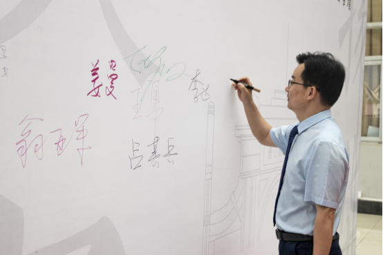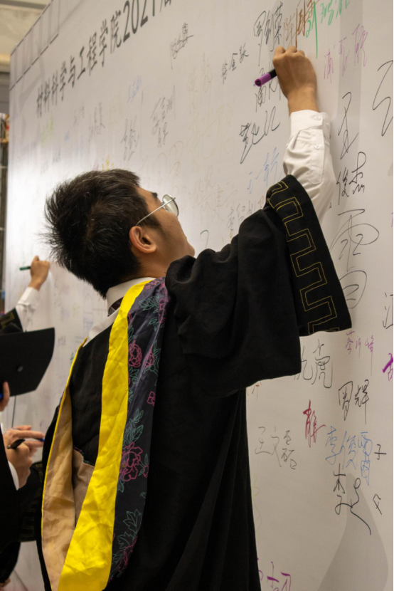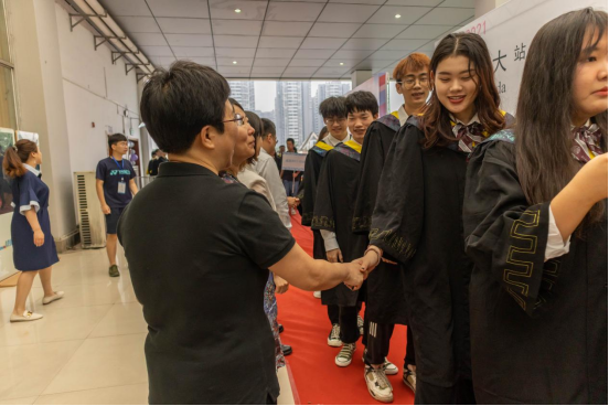 上午8:00,入场式正式开始,提前等候全体毕业生入场的老师们两边列队夹道欢迎,同学们顺着照片墙、结对步入红毯,与老师们逐一握手入场,在留言墙签下姓名,迈入典礼现场,入场式隆重、庄严而又温馨。踏上红毯,寓意着毕业生即将结束大学本科就读征程,也将开启人生新的征程。