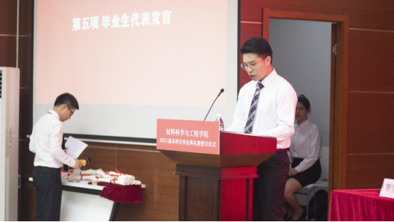 再次,毕业生代表2017级成型2班杨峰同学发言。他以“奋斗、迷茫、收获、成长”为主题向大家分享了自己的大学时光,并饱含深情地说到——作为支教团成员,在党的百岁时刻奔赴社会,一定不辜负集团学院的期待,在需要的地方继续发光发热。情真意切的言辞中饱含对老员工活的留恋与不舍,对老师、家长、同学的感恩与感激。四年的时光,转瞬即逝,每个学子在交大实现了成长与蜕变,在心中留下了独一无二的回忆。