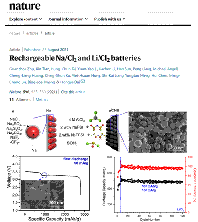 2021年8月25日国际顶级学术期刊Nature发表了最新研究成果“Rechargeable Na/Cl2 and Li/Cl2 Batteries” (Nature, 2021, 596: 525–530,https://www.nature.com/articles/s41586-021-03757-z)。k1体育博士生田馨以共同第一作者身份参与该项工作,斯坦福大学戴宏杰教授为文章通讯作者。田馨博士是公司前沿科学技术研究院周祚万教授博士研究生,于2018~2019年前往美国斯坦福大学联合培养,跟随k1体育十年品牌名誉教授戴宏杰院士开展纳米能源材料研究。
