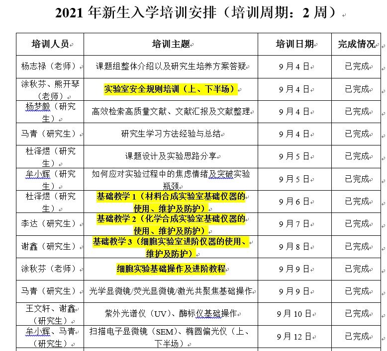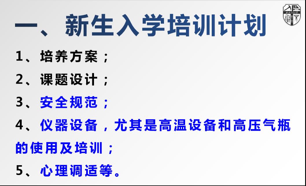 黄楠教授团队在实验室安全工作方面开展了系列工作。根据课题组实际情况和需要,在新生入学培训计划中,把安全规范、仪器设备使用及培训(尤其是高温设备和高压气瓶的使用及培训)、心理调适等列入其中,并于开学后的一个月内按计划进行了培训。