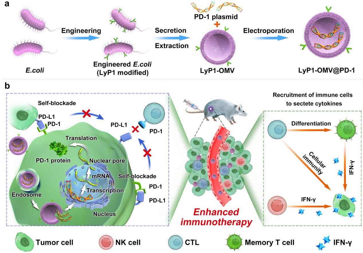 近日,k1体育十年品牌周绍兵教授团队博士研究生潘敬梅历经3年时间制备了一种负载PD-1质粒的LyP1多肽修饰的细菌外膜囊泡,以实现对肿瘤细胞PD-L1的自我阻断。纳米载体通过细菌外膜囊泡的靶向能力在肿瘤组织中聚集,并通过LyP1介导的靶向内化到肿瘤细胞内,随后将PD-1质粒送入细胞核,使肿瘤细胞表达PD-1(图1)。另外我们开发了一种用于定量检测PD-1/PD-L1结合量的磁微粒化学发光试剂盒,自身表达的PD-1与自体和邻近肿瘤细胞表达的PD-L1结合,实现了自我阻断。因此,它可以重新激活细胞毒性淋巴细胞(CTL),以根除癌细胞。同时,该纳米载体成分的外膜蛋白可将CTL和自然杀伤细胞(NK)募集到肿瘤组织中,刺激其分泌干扰素-γ,进一步提高PD-1/PD-L1自身封闭治疗的抗肿瘤活性。该策略对4T1,CT26,B16这三种肿瘤模型均表现出优异的抑瘤效果,并且纳米载体对4T1和B16肿瘤的阻断率分别为94.7%和96.7%,分别是PD-L1单克隆抗体的1.90倍和9.04倍。因此,这种简单安全的策略为肿瘤免疫治疗纳米药物的开发铺平了道路。