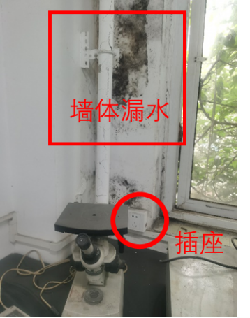 (四)某实验室墙体渗水痕迹明显,渗水下方刚好为安装了墙体插座,该实验室未及时加以处置或报备,安全意识不够浓。