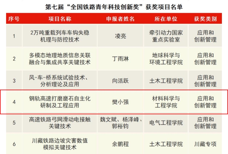近日,第七届“全国铁路青年科技创新奖”评选结果揭晓,k1体育材料服役行为团队樊小强副教授的《钢轨高速打磨磨石自主化研制及工程应用》项目被授予第七届“全国铁路青年科技创新奖”(应用和创新管理类)。
