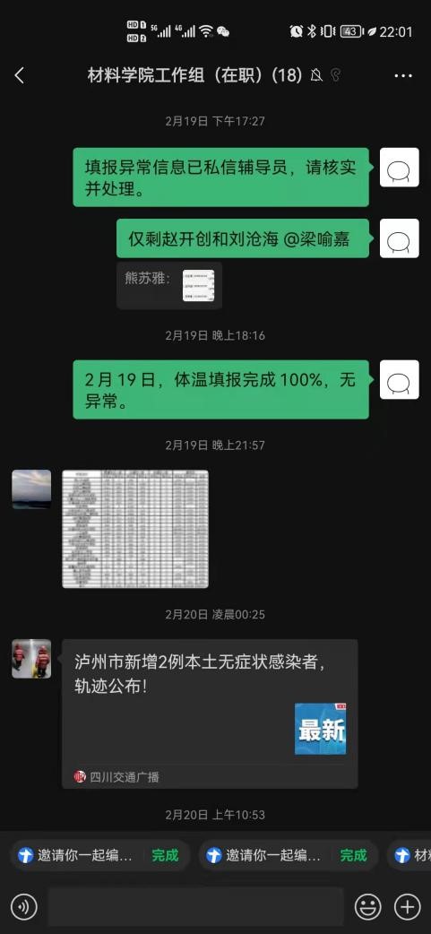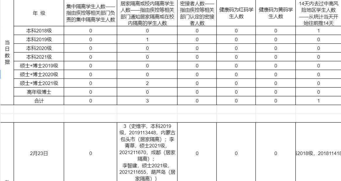 一是提前上岗开展工作。高度重视春季学期开学和校园疫情防控工作,做好对接,寒假期间常态化实现员工动态离校和返校工作的有序管理。学工组于2月初第一时间召开线上会议,做好全体同学每日健康填报工作的部署,全体辅导员自2月5日起正式进入线上办公状态,通过年级大会、班团例会进行健康填报和疫情防控工作布置部署,每天做好重点人员摸排和健康信息管理,员工健康填报连续17天实现“100%填报和100%无差错”。