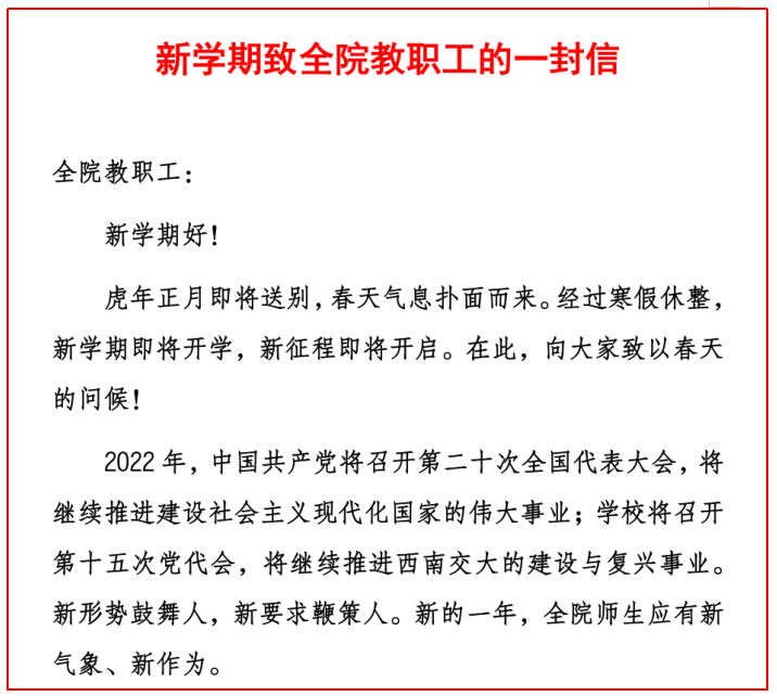 开学前三天(2022年2月22日),公司党委书记陈勇、经理朱旻昊共同向全院教职工发出一封信,强调学院2022年工作重心将着力“安全稳定、学科发展、民生工程”三大方面,重点推进“全面加强党建和思想政治工作”、“谋划和启动新一轮‘双一流’建设项目”、“着力加强团队(人才)队伍建设”、“精心布局和争取国家级奖项”、“继续优化教学科研和人才培养环境”五项工作。他们还提醒每一位教职工重视身心健康,加强身体锻炼;重视安全稳定,确保人身安全、政治安全、消防安全、财产(物)安全和保密安全等;重视师德师风,守师德底线奔师德高线。号召全院上下同心同德、同向同行,齐心协力推进学院改革建设发展,祝福大家身体健康、家庭幸福。