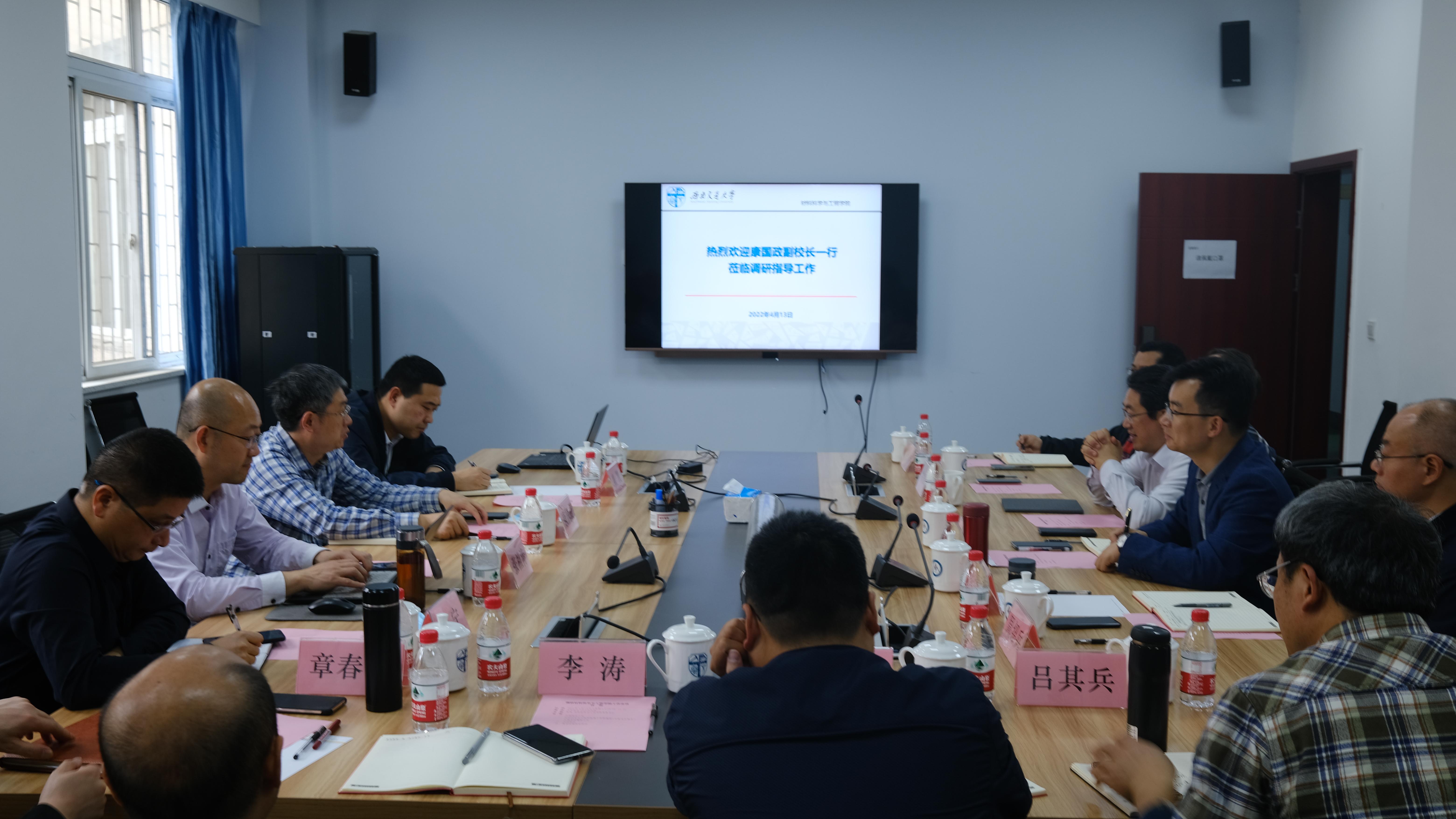2022年4月13日下午,副董事长康国政、教务处处长崔凯、工程训练中心主任张祖涛、教务处副处长代宁到公司调研。会议在九里校区3310会议室举行。公司党政班子成员、各本科专业方向责任教授等参加会议。经理朱旻昊主持会议。